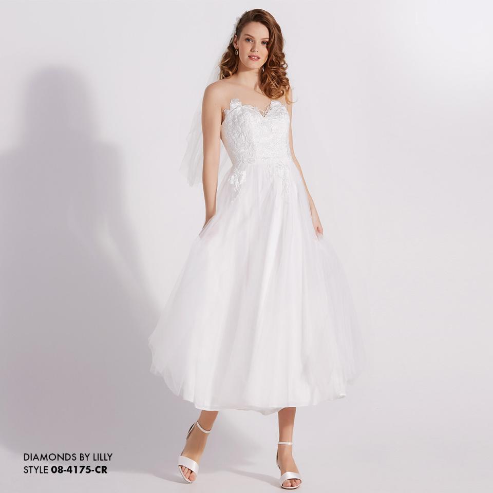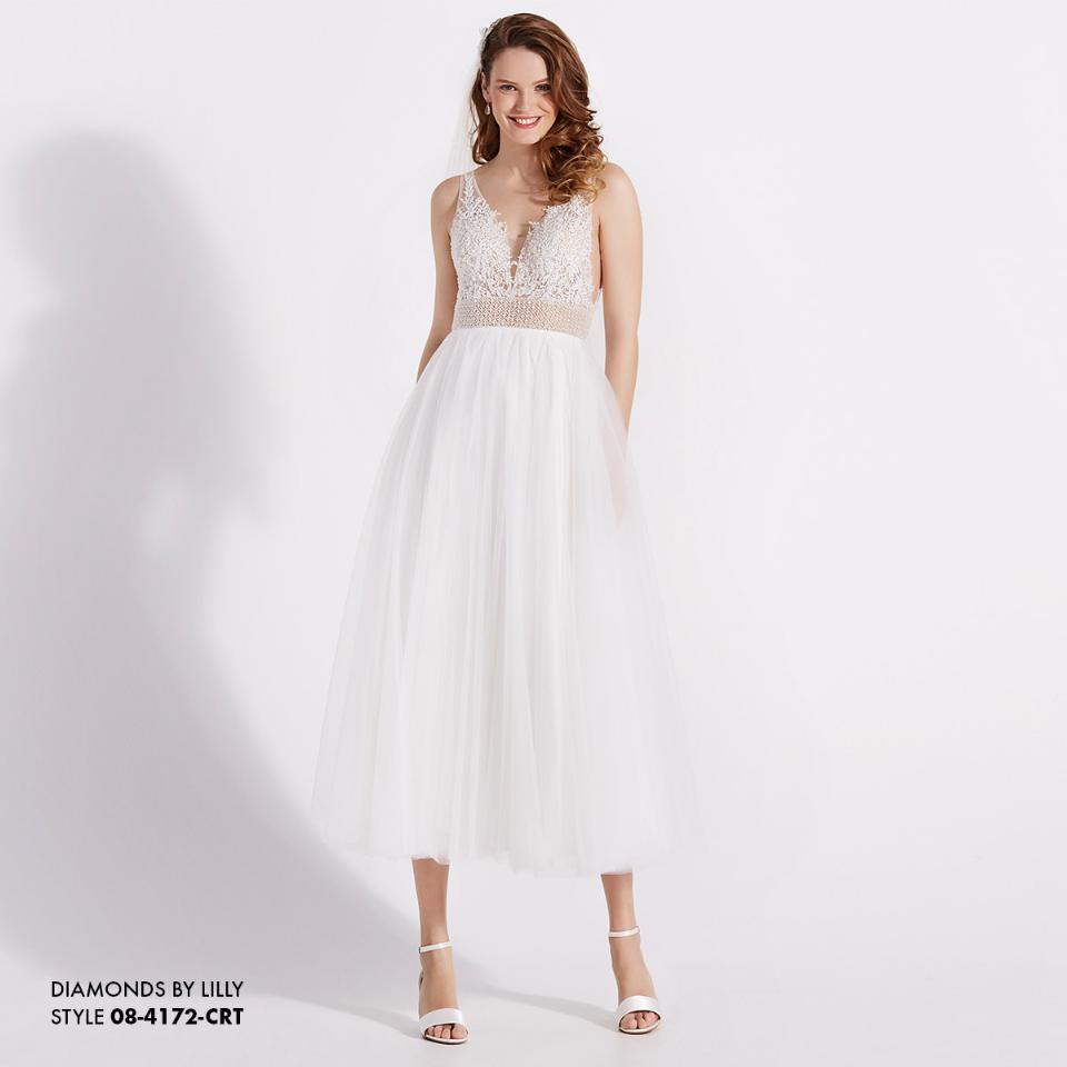 Til det mere utraditionelle bryllup eller vielse på et rådhus vælger mange brude at klæde sig i en kortere kjole, men beholde den hvide farve som hører bruden til. DIAMONDS by LILLY er netop designet til at kunne bæres på én gang uformelt, festlig og elegant. En lille ædelsten, der kan styles op eller ned med tilbehør, slør, brudebælte eller forvandles med et snuptag til en lang kjole, med et seperat brudeskørt fra Mix & Match kollektionen.