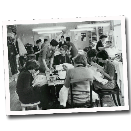 Det var kort efter krigen og der var rationaliseringer på alt – især stof. Kjoleateliet syede derfor omforandringer af tøj til spadseredragter, jakker og kjoler. Alt slags stof blev taget i anvendelse, når der ikke var andet til rådighed: gardiner, sofabetræk, lagner etc..
